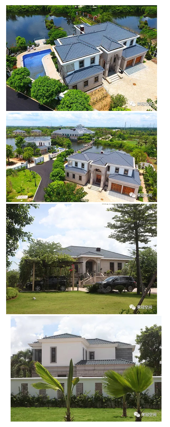 榮冠西瓦具備隔熱好、耐久性、色彩鮮艷等諸多功能和特色,造型起伏多變,富有古典的歐式風味,鋪蓋后自然高雅,格調獨特,是各種中高檔酒店別墅、樓宇亭臺、大型商業中心、市政工程等建筑的首選屋面裝飾材料。