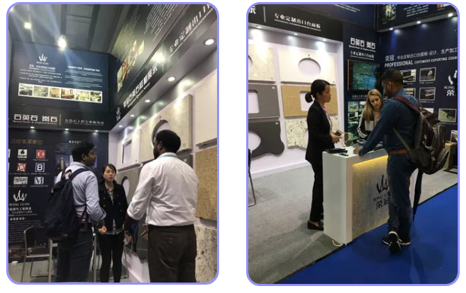 榮冠出口部工作人員向蒞臨展位的客戶講解了榮冠石英石臺面產品的品質優勢,與來自全球各地的客商深入洽談合作。