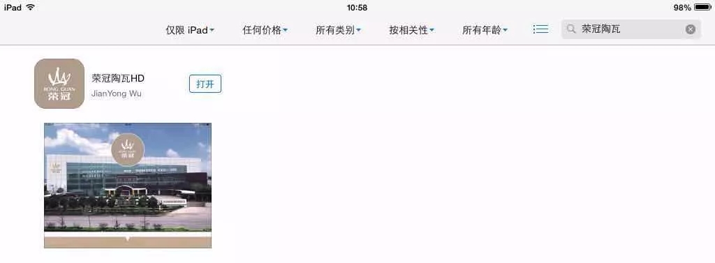 對于之前沒安裝過的客戶朋友,也可以通過打開 ipad自帶的AppStore(蘋果商店)搜索“榮冠陶瓦”進(jìn)行下載安裝(如下圖所示)。安裝成功后即可直接使用。