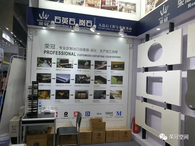 榮冠石材展位以白色作為主背景,搭配藍(lán)黑色邊框,在整個(gè)展區(qū)尤為顯眼。榮冠石材專業(yè)定制出口臺(tái)面板,以匠心為客戶提供優(yōu)質(zhì)的產(chǎn)品和服務(wù)。本次展位除了展示我司最新石材精品和臺(tái)面板加工工藝外,還重點(diǎn)突出了我司人造石應(yīng)用在國(guó)內(nèi)大型商業(yè)工程中的諸多案例,展現(xiàn)出榮冠石材的品牌優(yōu)勢(shì)與技術(shù)實(shí)力。
