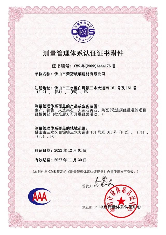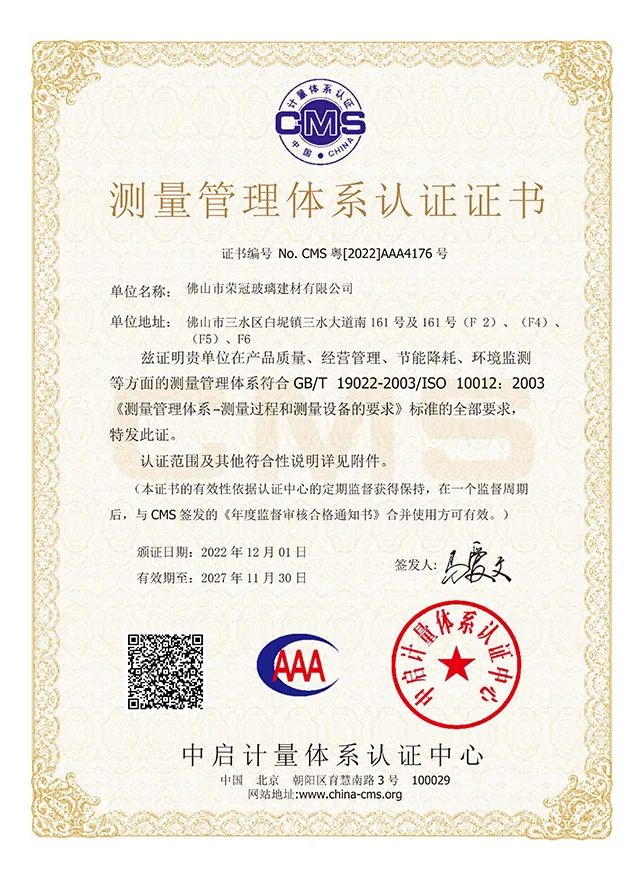 獲得測量管理體系認證證書,是榮冠公司向客戶及合作伙伴傳遞信任的有效證明;是政府和社會對企業滿足計量要求的一種客觀、公正的認可;是企業參與國家采購、國內外招投標、國家及地方質量獎、地方名牌產品評價的重要條件之一。